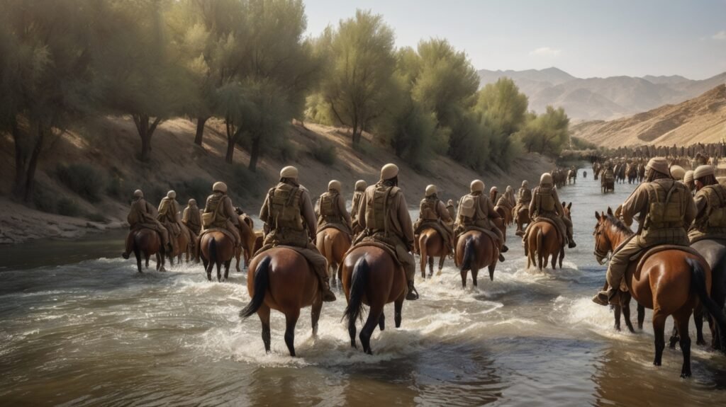 फिर बिना हिचकिचाहट उन्होंने अपने घोड़ों को दरिया में डाल दिया। इस वाक़िये ने सेना को ऐसा जोश और यक़ीन दिया कि सभी सिपाहियों ने भी अपने घोड़ों के लगाम छोड़ दिए और दरिया में कूद पड़े।