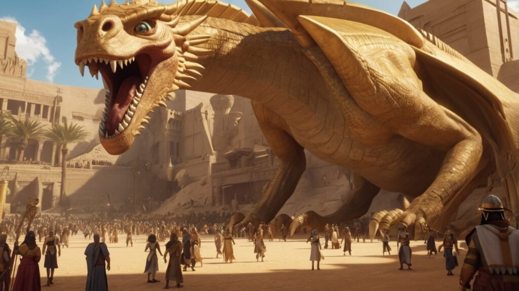 एक जबड़ा ज़मीन पर था और दूसरा क़िले की दीवार पर। जब उस अजदहे ने फ़िरऔन की तरफ़ रुख़ किया तो फ़िरऔन अपने तख़्त से कूदकर भाग गया।