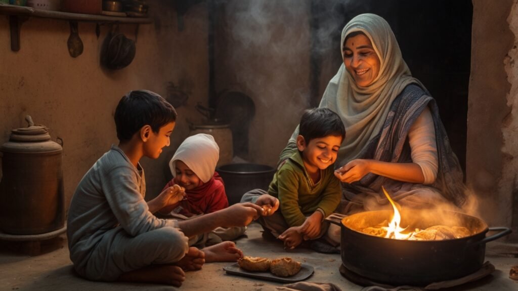 • एक बच्चा: अम्मी, बहुत देर हो गई है, रात आधी हो गई और अब तक खाना नहीं बना।